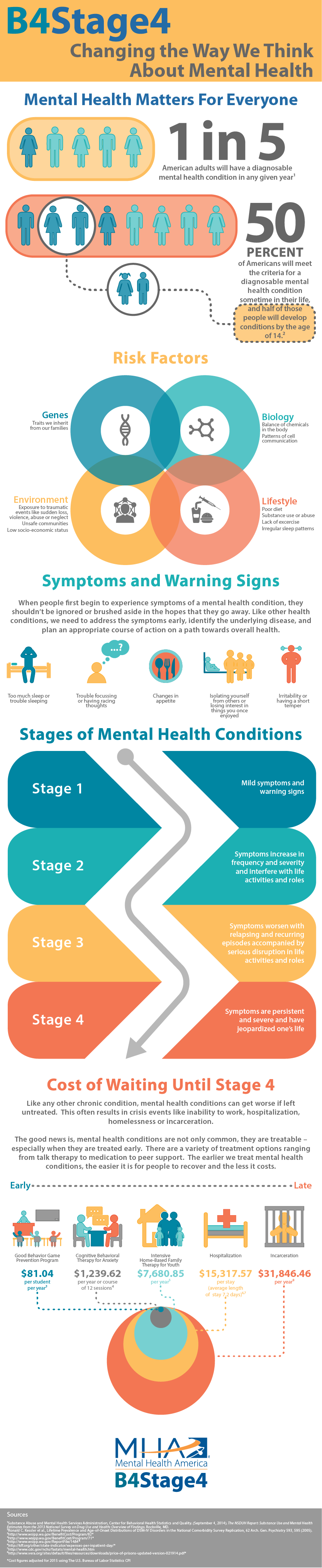 We start before Stage 4—we begin with prevention. When people are in the first stage of those diseases and are beginning to show signs or symptoms like a persistent cough, high blood pressure, or high blood sugar, we try immediately to reverse these symptoms. We don’t ignore them. In fact, we develop a plan of action to reverse and sometimes stop the progression of the disease. So why don’t we do the same for individuals who are dealing with potentially serious mental illness?